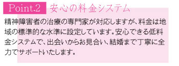 良心的な価格設定と一人ひとりの精神症状や保健福祉の制度の活用も視野に入れた、個別性にも十分配慮した結婚相談サービスをご提供いたします。