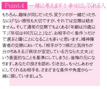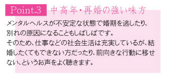 メンタルが不調だとなかなか結婚のお相手が見つけられず、深刻な状況の人しかいないなかで私達が結婚につなげるお手伝いをさせていただきます。他の相談所では十分な対応ができず、ほかの相談所に登録している方も少ないため、当協会のみのお見合いに参加していただける方が多く、成婚にもつながりやすい特長があります。